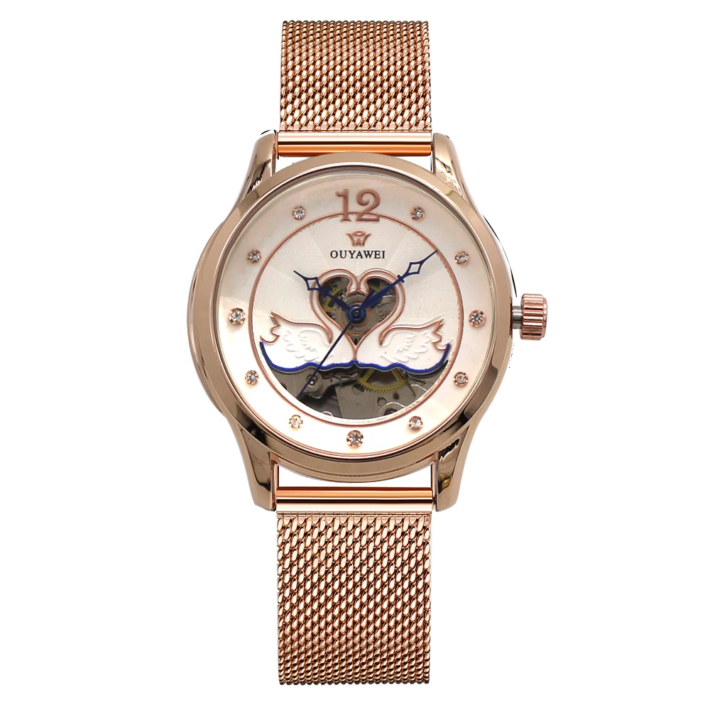 OUYAWEI Fashion Brand Women Mechanical Watches Women Mesh Stainless Steel Strap Fashion Skeleton Di