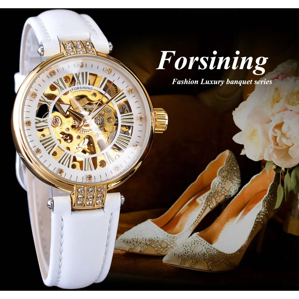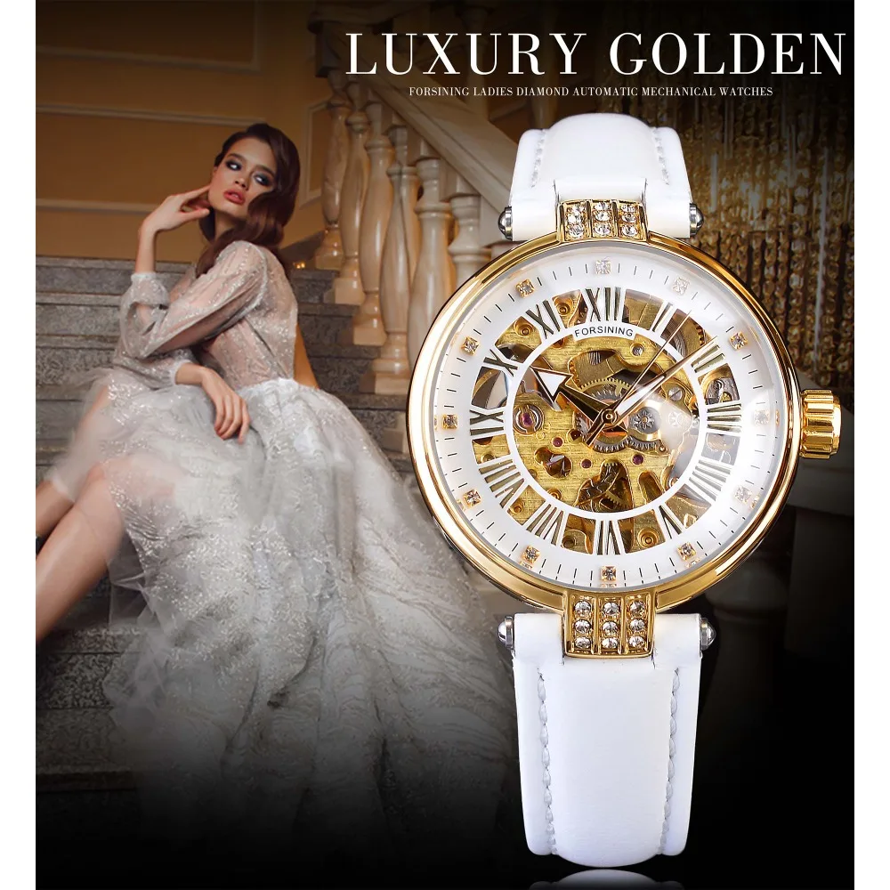 ORIGINAL Forsining White Golden Mechanical Automatic Luxury Top Brand Lady Wrist Watch Skeleton Clock Women