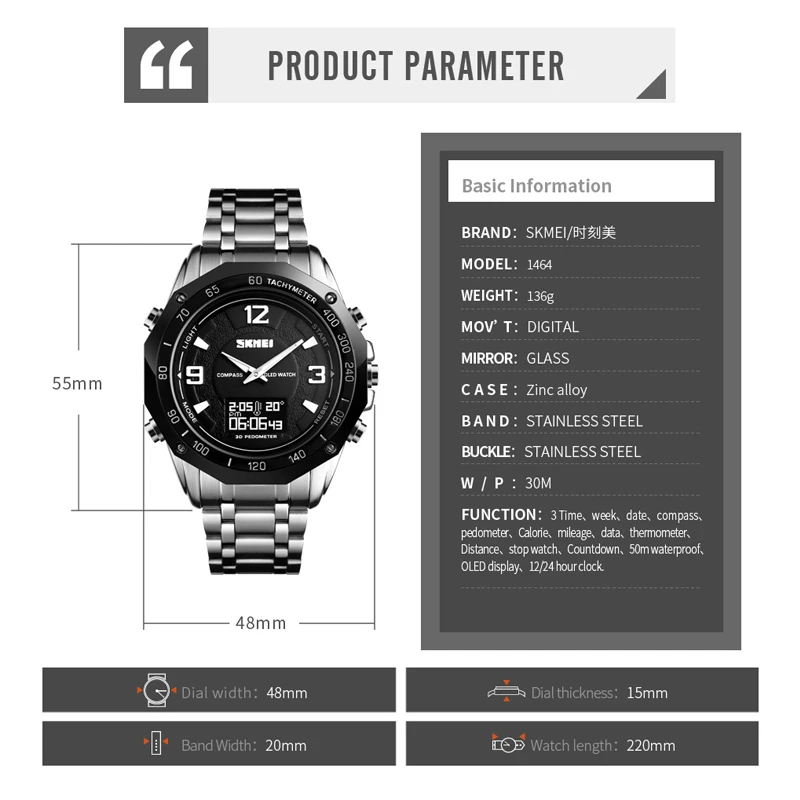 SKMEI Men Digital Watch Luxury Compass Temperature Electronic Wristwatch Fashion Calorie Pedometer
