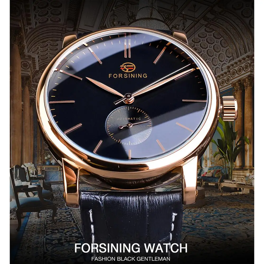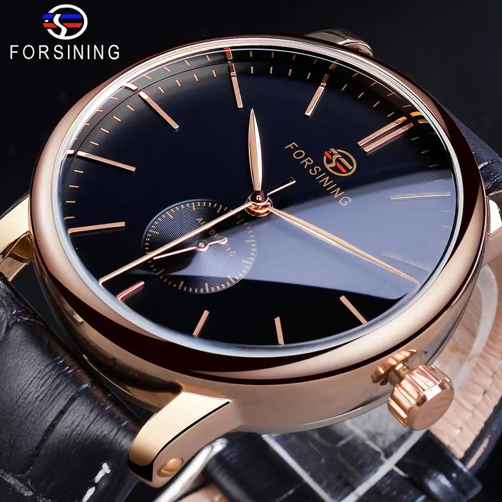 Review Top Forsining Casual Automatic Mechanical Watch Men's Sub Dial Black Slim Simple Black Genuine Leather