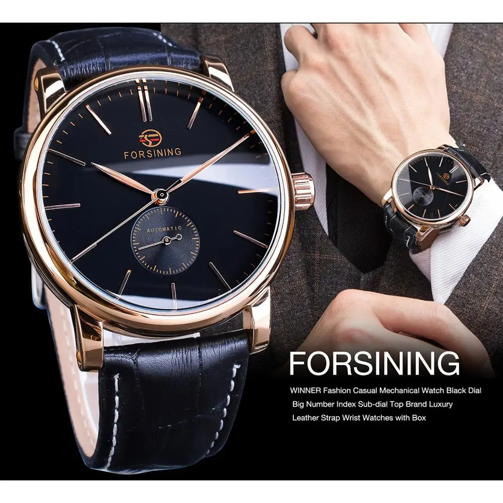 REVIEW TOP SELLER Forsining Casual Automatic Mechanical Watch Men's Sub Dial Black Slim Simple Black Genuine Leather